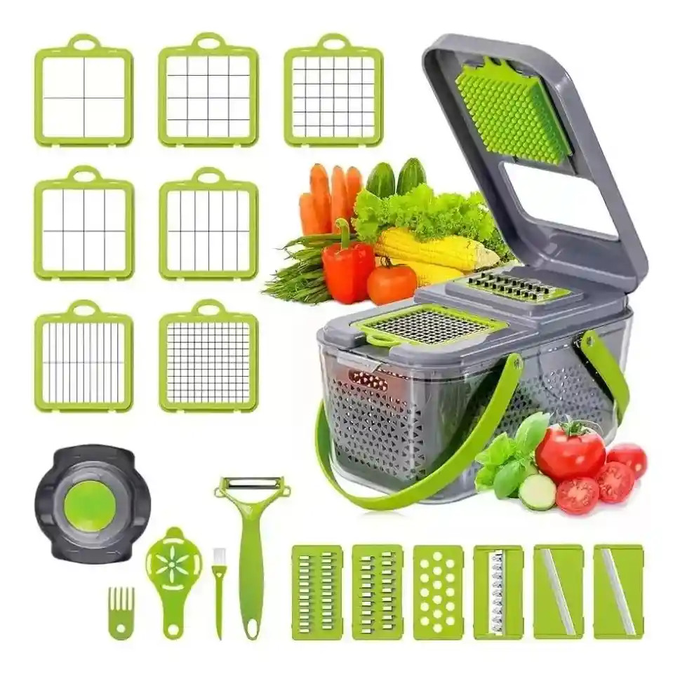 Eficiencia que ahorra tiempo: di adiós al corte y corte manual. El picador de verduras Maestrox reduce el tiempo de preparación al procesar sin esfuerzo una variedad de frutas, verduras y más en segundos. Corte de precisión para cada comida: logra cortes consistentes y uniformes para platos de aspecto profesional. Las cuchillas afiladas y duraderas aseguran que cada ingrediente se corte, corte en cubitos o ralle perfectamente en todo momento. Hojas de acero inoxidable de alta calidad: construidas para durar, las cuchillas de acero inoxidable de la picadora se mantienen afiladas con el tiempo, lo que garantiza cortes suaves y eficientes con el mínimo esfuerzo, incluso para verduras duras como zanahorias y papas. Base antideslizante para mayor estabilidad: la picadora de verduras Maestrox cuenta con una base antideslizante que la mantiene firmemente en su lugar mientras se corta, ofreciendo una mayor estabilidad y control durante el uso. Perfecto para todas las edades: ya sea que seas un novato en cocina o un chef experimentado, el picador de verduras Maestrox es fácil de usar, lo que facilita la preparación de comidas para cualquier persona en la familia, desde niños hasta adultos. Viene con caja de almacenamiento: la picadora incluye una conveniente caja de almacenamiento para mantener todos sus accesorios organizados, lo que facilita el almacenamiento de todos los componentes en un solo lugar cuando no está en uso. Seguro y fácil de operar: con su diseño seguro y fácil de usar, el picador de verduras Maestrox minimiza el riesgo de lesiones accidentales al tiempo que te permite preparar rápidamente tus ingredientes. Perfecto para una variedad de platos: ya sea que estés haciendo ensaladas, sopas, salsas, salteados o batidos, el picador de verduras Maestrox es una herramienta versátil que te ayuda a crear innumerables platos con facilidad. 22PCS