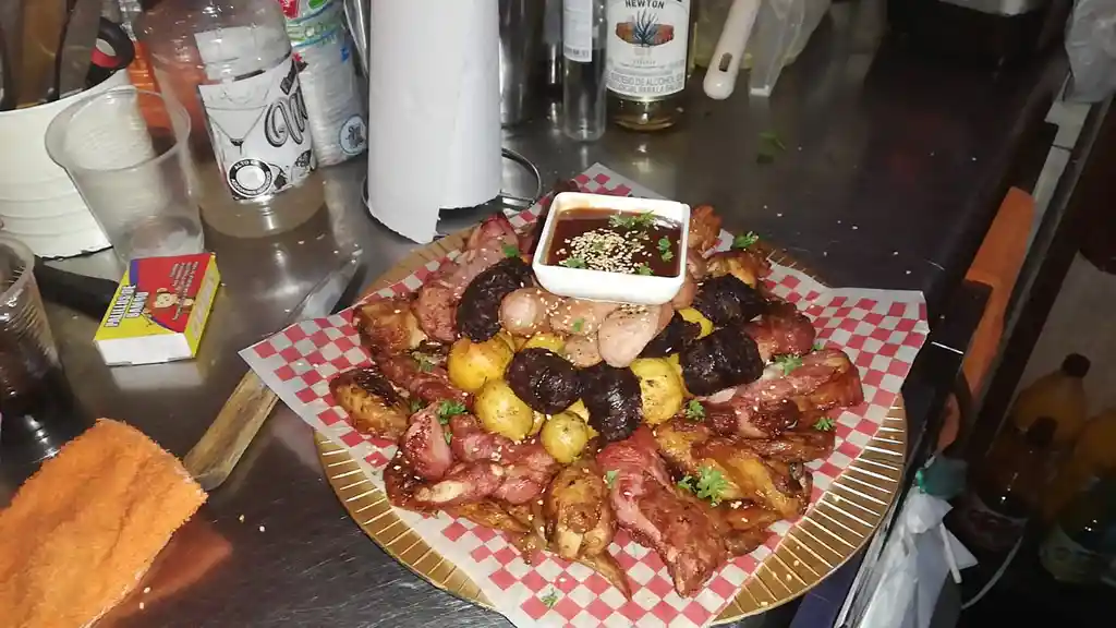 picada, costillas de cerdo ahumadas y bañadas en salsa BBQ (500gr) , alitas bañadas en salsa BBQ (900gr) y papa (225gr)mas morcilla y chorizo