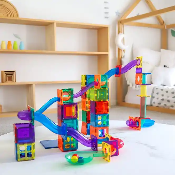 Empaque de regalo sin costo adicional 3 años + Descubre el aprendizaje STEM a través de la construcción de laberintos, caminos y túneles con piezas magnéticas perfectas para los pequeños ingenieros.Este increíble juego de construcción de laberintos con 100 piezas de colores incluye 16 Semi U, 34 figuras geométricas, 20 toboganes soporte, 8 túneles, 6 giros en U, 3 embudos, 3 pendientes, 4 triángulos equiláteros, 5 esferas de juego y 1 cuadrado. Promueve el entrenamiento de habilidades motoras finas, coordinación ojo-mano, creatividad y razonamiento lógico.