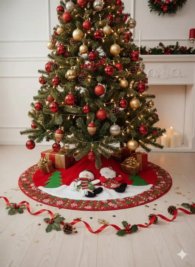 🎅⛄Pie de árbol acolchado con una hermosa escena invernal un alegre Papá Noel con su característico traje rojo y un adorable muñeco de nieve sonriente. Los colores vivos y los detalles bordados aportan calidez y encanto, convirtiendo el árbol en el centro perfecto de la Navidad.