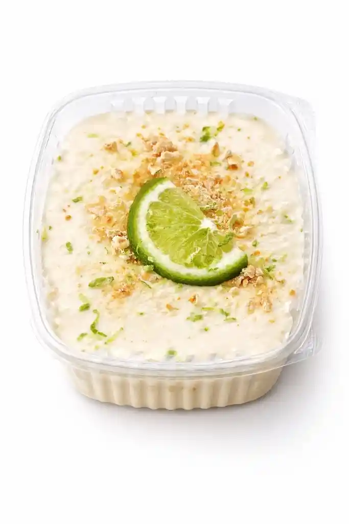 Postre con base de galleta dulce, crema de leche y limón, coronado con ralladura de limón y galleta.