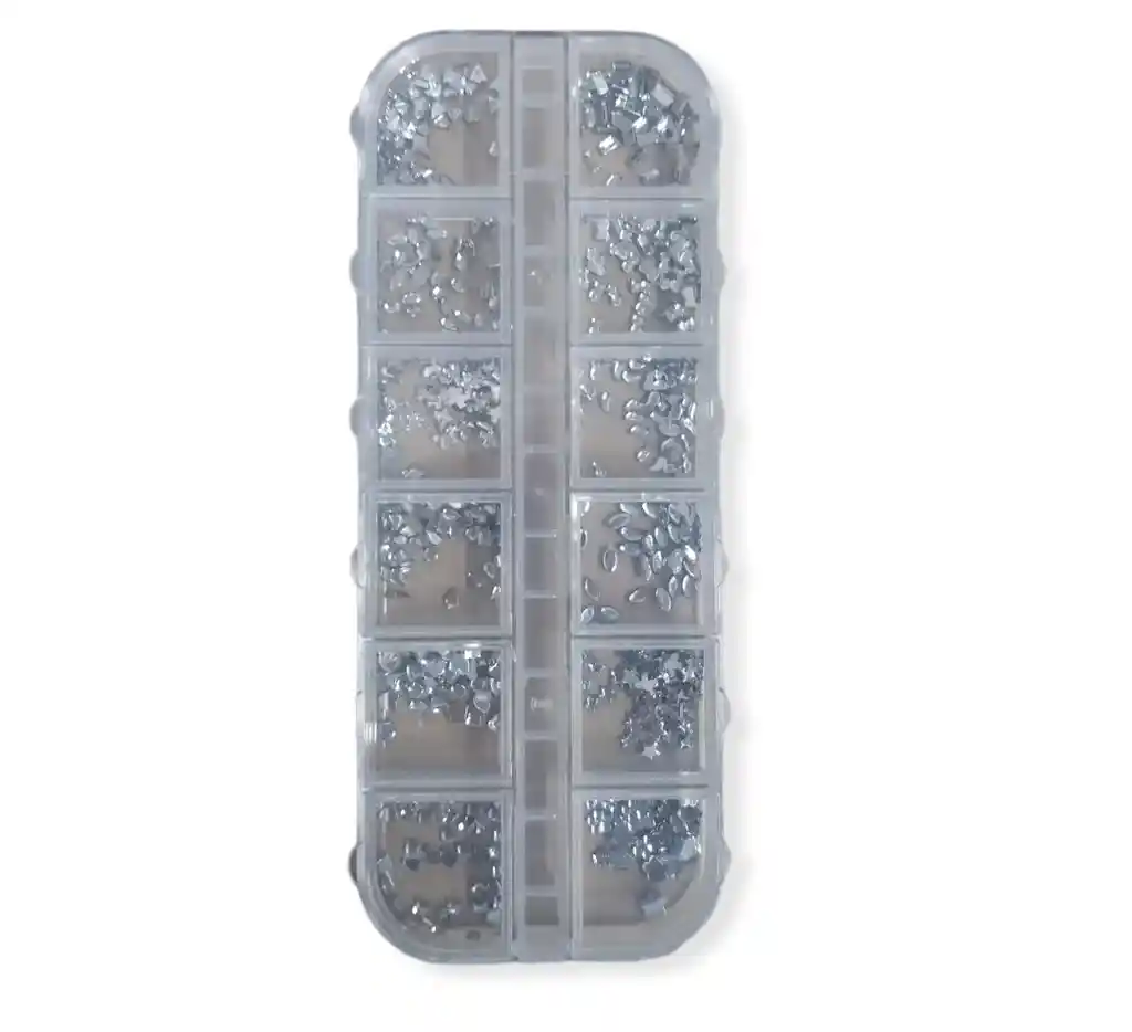 Piedras de diferentes figuras (corazones, triángulos, rectángulos, flores, mariposas, etc.) color plateadas, para realizar decorados hermosos en las uñas.