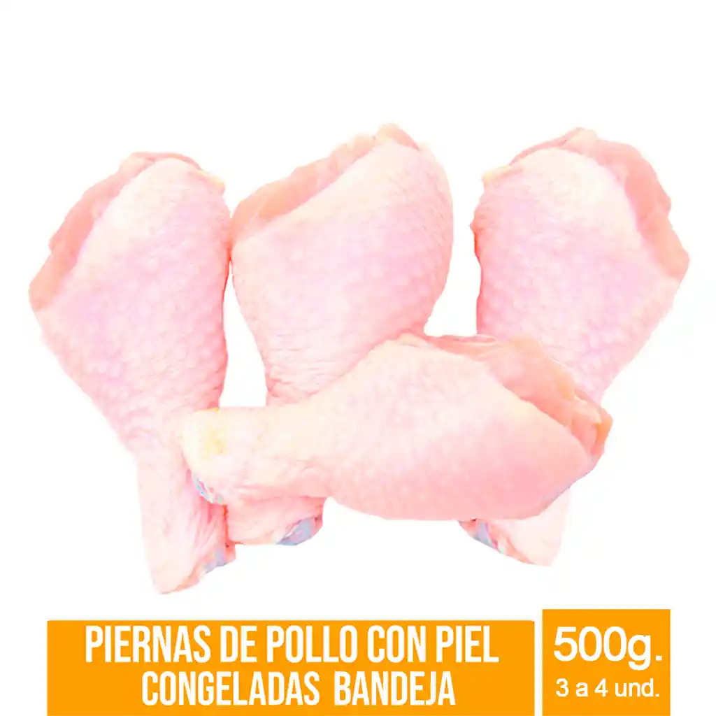 Piernitas de pollo con piel congeladas bandeja, presentación por 500g, unidades aproximadas por bandeja entre 3 y 4 dependiendo del peso.