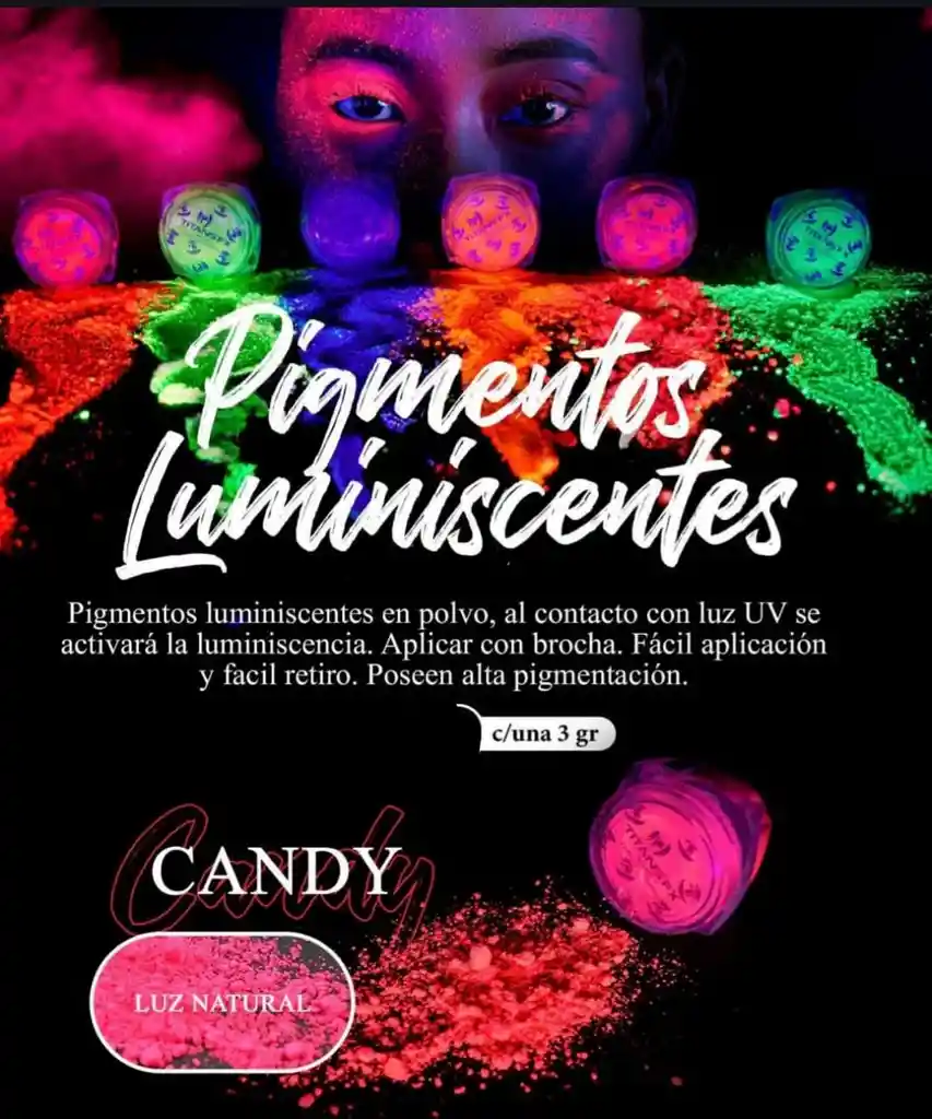 Pigmentos luminiscentes en polvo, al contacto con la luz UV se activara la luminiscentes