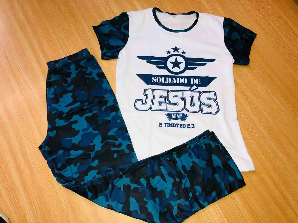 PIJAMA DAMA EN PIEL DE DURAZNO AZUL CON BLANCO MANGA CORTA CON MENSAJE CRISTIANO TALLA M
