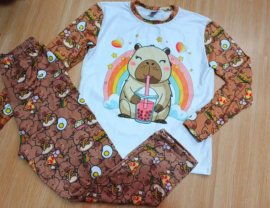 PIJAMA CAPYBARA EN PIEL DE DURAZNO MANGA LARGA CAFE CON BLANCO TALLA 14