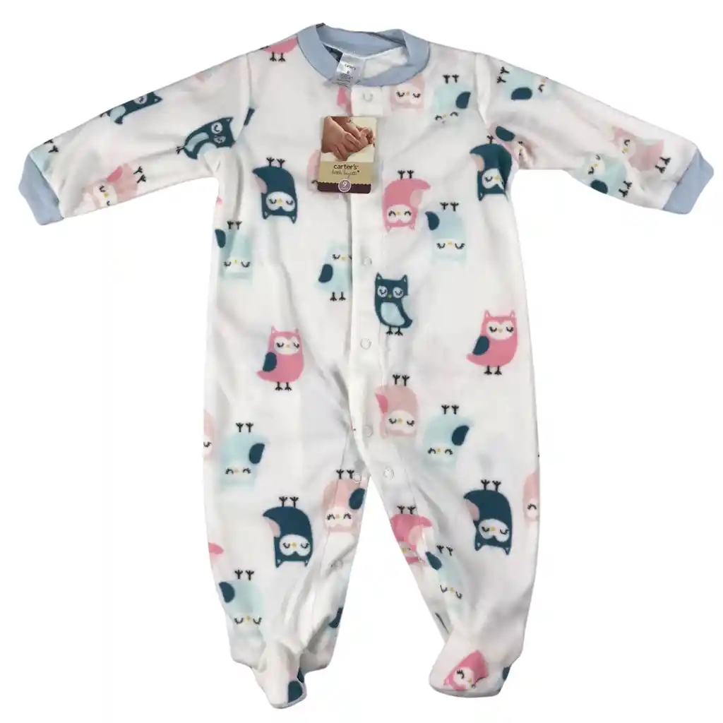 Pijama enteriza para bebé talla 0 a 3 meses, elaborada en tela suave y abrigadora, ideal para la piel delicada del recién nacido. Presenta diseño en color blanco con estampado de búhos en tonos pastel, broches frontales que facilitan el cambio de pañal y pies cubiertos para mantener al bebé abrigado y cómodo durante el descanso. El producto incluye Pijama enteriza de manga larga con broches frontales Pies cubiertos integrados Prenda cómoda, práctica y perfecta para el descanso diario o como regalo para recién nacido.