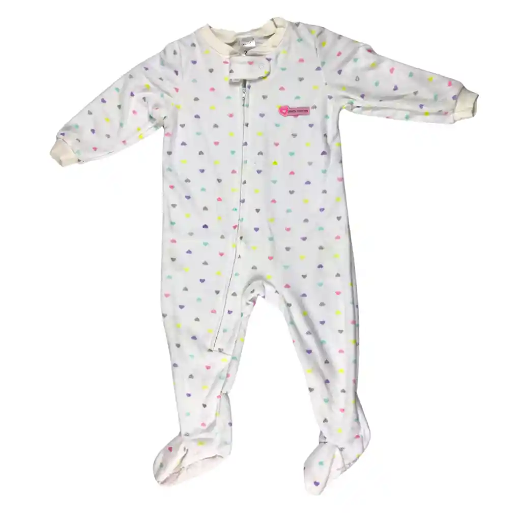 Pijama enteriza para bebé talla 18 a 24 meses, confeccionada en tela suave y cómoda, ideal para la piel delicada del bebé. Presenta diseño en color blanco con estampado de pequeños corazones multicolor, perfecta para brindar abrigo ligero y confort durante el descanso. Cuenta con cierre frontal que facilita el cambio de ropa y pies cubiertos para mayor protección y calidez. El producto incluye Pijama enteriza de manga larga con cierre frontal Pies cubiertos integrados Es una prenda práctica, cómoda y funcional, ideal para el uso diario o para la hora de dormir.