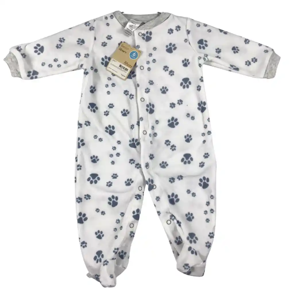 Talla 6 a 9 meses Pijama enteriza para bebé talla 6 a 9 meses, elaborada en tela suave y abrigadora, ideal para brindar comodidad y calidez durante el descanso. Presenta diseño en color blanco con estampado de huellitas en tono gris, cierre frontal con broches que facilita el cambio de pañal y pies cubiertos para mayor protección. Es una prenda práctica, cómoda y perfecta para el uso diario o la hora de dormir. El producto incluye Pijama enteriza de manga larga con broches frontales Pies cubiertos integrados Ideal para climas frescos, descanso nocturno o como regalo para bebé.