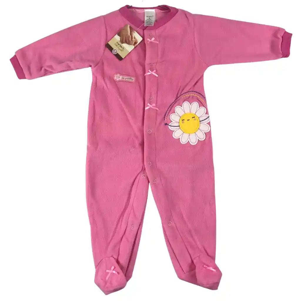 Pijama enteriza para bebé talla 3 a 6 meses, confeccionada en tela suave tipo fleece, ideal para brindar abrigo y comodidad durante el descanso. Su delicado diseño en color rosado incluye un aplique bordado de flor, aportando un estilo tierno y elegante. Cuenta con broches frontales que facilitan el cambio del bebé y pies cubiertos para mayor protección térmica. Incluye: Pijama enteriza de manga larga Broches frontales para fácil colocación Pies cubiertos integrados Aplique bordado decorativo Prenda práctica, cómoda y perfecta para el uso diario del bebé.