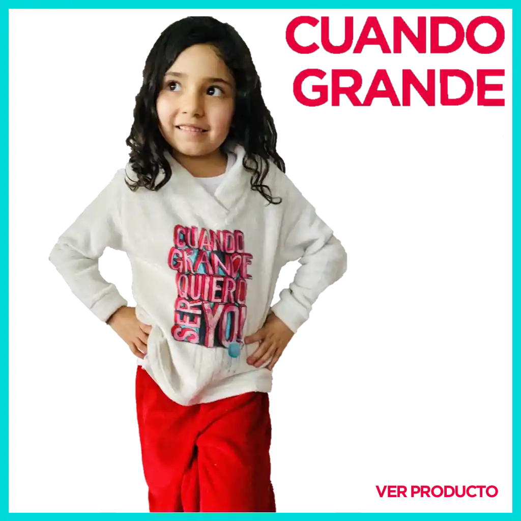 Pijama infantil en fleece de 2 piezas Talla 2, con ilustración y leyenda: Cuando grande quiero ser yo. Hecho en Colombia, Suave, térmica y cómoda. Ideal para noches frías y fácil de lavar.