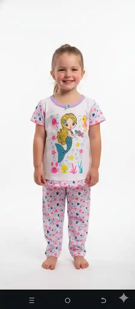 Linda Pijama manga corta cuello redondo de color blanco con estamapado de sirena muy colorida, Pantalones Largos estampado en tela de algodon TALLA 6