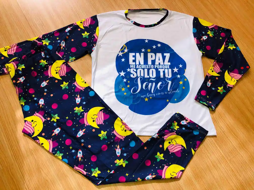 PIJAMA DAMA EN PIEL DE DURAZNO AZUL MANGA LARGA CON MENSAJE CRISTIANO TALLA L/XL