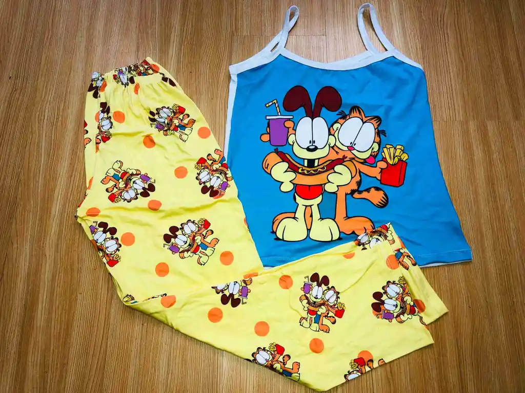 PIJAMA DAMA EN PIEL DE DURAZNO AZUL CON AMARILLO DE TIRAS TALLA L
