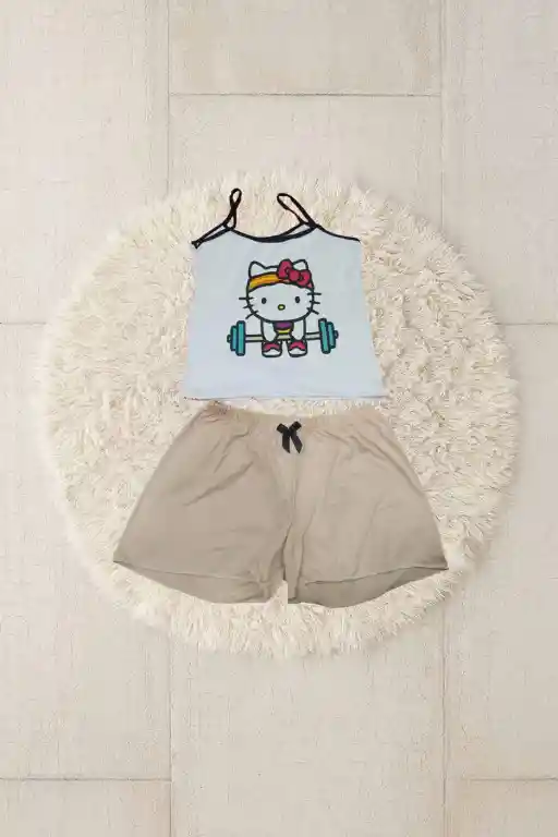 Pijama de 2 piezas color beige con blanca estampada de hello kity, Talla unica