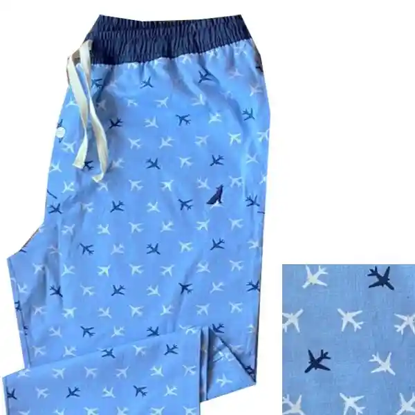 Pantalón de Pijama fondo azul claro con Miniprint de aviones en azul oscuro y blanco Composición: 100% AlgodónCaucho y cinta en la cinturaBolsillos lateralesHecho en Colombia