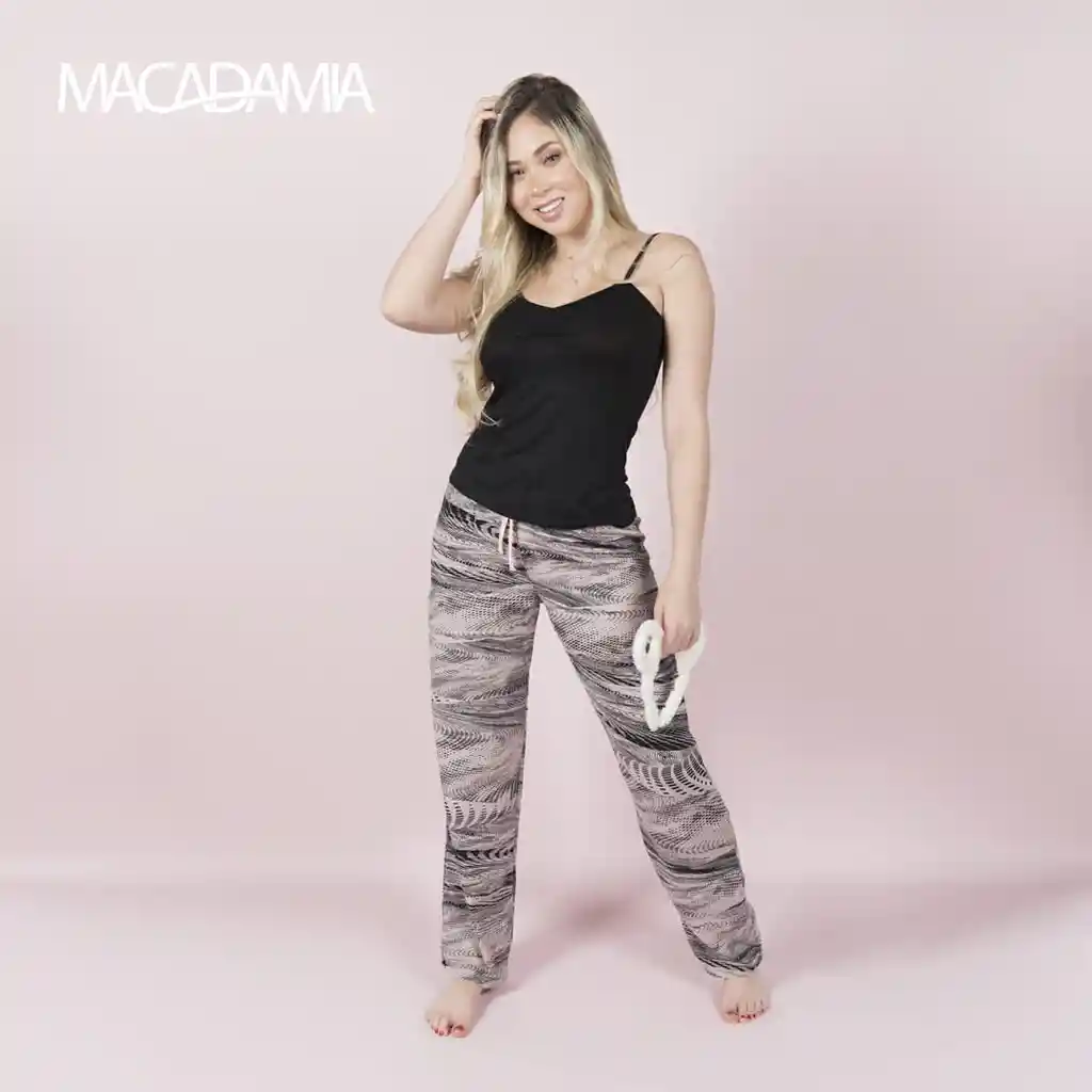 Pijama de pantalón largo estampado, enresortado en cintura, cordón ajustable. Blusa en tiras 100% algodón.