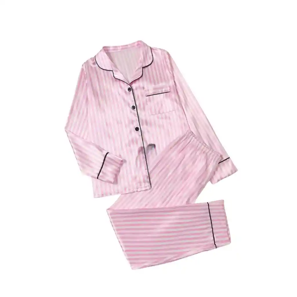 Esta hermosa pijama de satén combina comodidad y estilo para tus noches de descanso. Su textura suave y fresca brinda una sensación agradable en la piel, ideal para dormir o relajarte en casa. El conjunto incluye: ✔️ 1 camisa de manga larga con botones frontales, bolsillo decorativo y ribetes negros que le dan un toque sofisticado. ✔️ 1 pantalón cuenta con pretina elástica para un ajuste cómodo y libre de presión. El diseño en rayas rosadas y blancas aporta un look femenino, limpio y muy delicado. ✔️Talla S ✔️ Material: Satén suave y ligero ✔️ Conjunto: Camisa + pantalón ✔️ Color: Rosado con rayas blancas ✔️ Detalles: Ribetes negros, botones frontales, pretina elástica ✔️ Estilo: Femenino, elegante y cómodo Perfecta para quienes buscan una pijama fresca, moderna y muy chic.