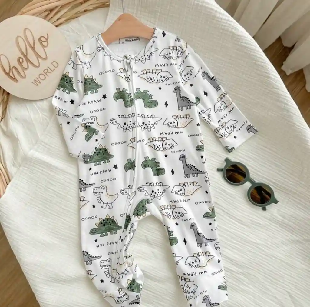 Talla disponible recién nacido . Noches de aventura y máxima comodidad! Esta pijama enteriza es la compañera ideal para que tu bebé duerma plácidamente, protegida de pies a cabeza con un diseño divertido y funcional. • Diseño Divertido: Estampado de dinosaurios en tonos verdes y grises sobre fondo blanco, un estilo moderno y tierno. • Cierre Frontal con Cremallera: Facilita el vestir y el cambio de pañal de forma rápida y segura, con protector en el cuello para no lastimar la piel. • Algodón Premium: Tela suave, elástica y transpirable que se adapta al movimiento del bebé y cuida su piel delicada. • Protección Total: Manga larga y diseño con pies cubiertos para mantener una temperatura ideal durante toda la noche en la ciudad.