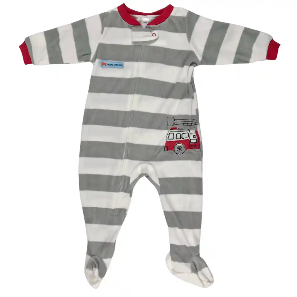 Pijama enteriza para bebé talla 9 a 12 meses, elaborada en tela suave y abrigadora, ideal para mantener al bebé cómodo y protegido durante el descanso. Presenta diseño a rayas en tonos gris y blanco con detalles en rojo y aplique bordado de camión de bomberos. Cuenta con cierre frontal completo que facilita el cambio de pañal y pies cubiertos para mayor abrigo y confort. El producto incluye Pijama enteriza de manga larga con cierre frontal Pies cubiertos integrados Prenda práctica, cómoda y funcional, ideal para dormir o para uso diario en climas frescos.