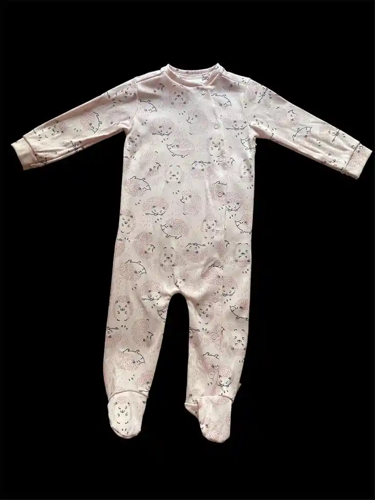 Pijama enteriza de piecitos, talla 12 meses, color rosado con dibujos de erizos líneas negras, con botones de presión metálicos desde el cuello hasta el pie manga larga y cobertura de los pies