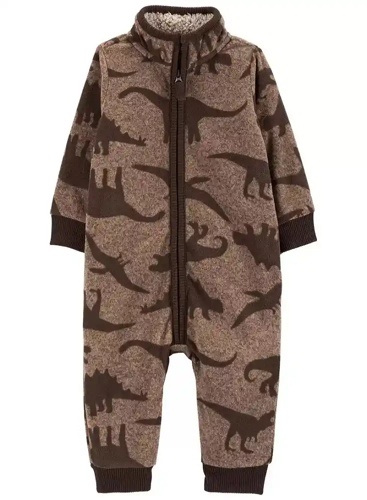 ¡Con solo una cremallera, tu pequeño hombre dinosaurio está listo para usar este acogedor mono de lana!