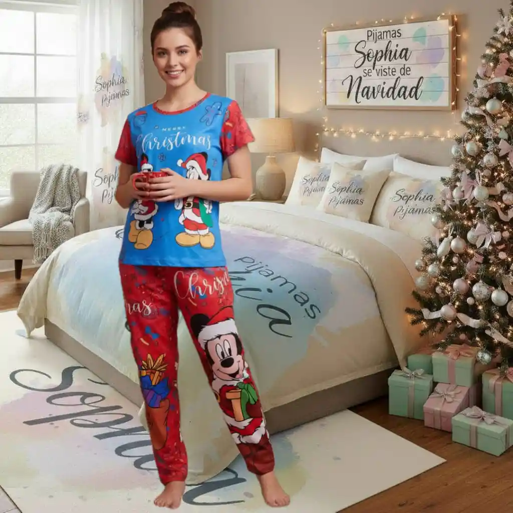 Descubre el encanto y la diversión de la Navidad con esta pijama especial de Pijamas Sophia. Bluzon azul con estampado de Mickey Mouse y Minie con mensajes navideños, combinada con un pantalón largo rojo decorado con Mickey en traje de Santa y detalles festivos, te ofrecen comodidad y alegría para compartir en casa, disfrutar tus reuniones familiares y crear recuerdos únicos. Su tela suave garantiza abrigo y la energía de Disney transforma cada noche en momentos llenos de fantasía. ¡Elige tu diseño favorito y vive la Navidad al máximo!