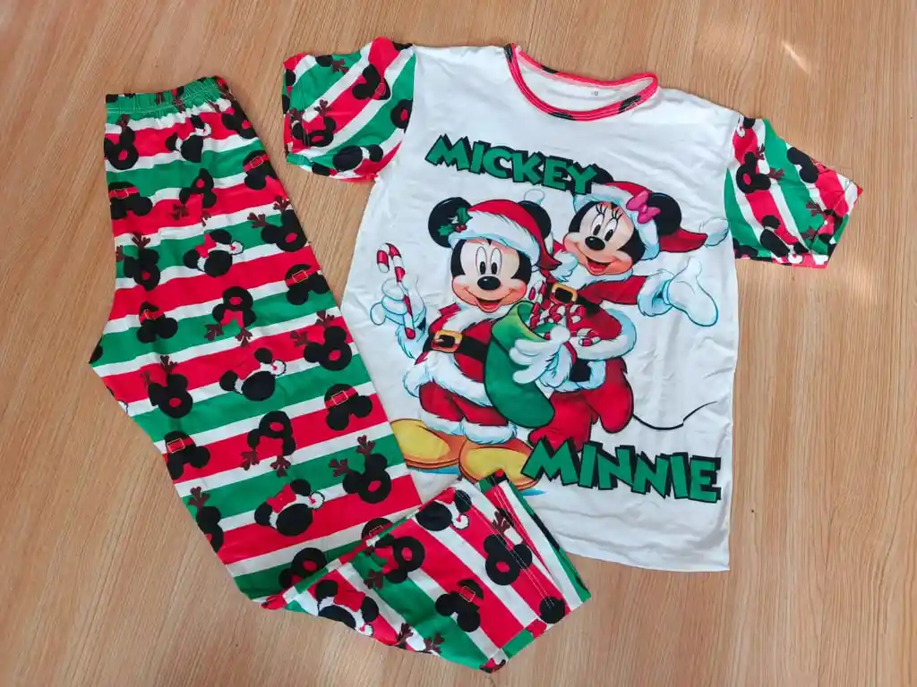 PIJAMA EN PIEL DE DURAZNO MANGA CORTA BLANCA CON DETALLES EN VERDE Y ROJO TALLA 10