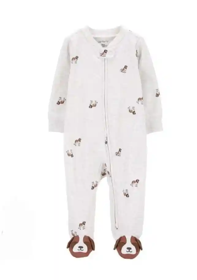 Pijama enterizo para niño de 9 meses, 60% algodón 40% poliéster, con dibujitos de perritos, un cierre desde el cuello hasta los pies con protección del cierre interna para cuidado del bebe y pies con carita de perrito. Color: Blanco crema con grises, perritos con líneas color negro con café