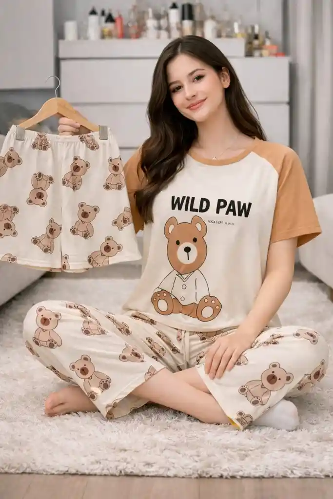 ✨ Pijama Oso Wild Paw Comfort Set X3 🛍️ Conjunto de pijama completo (camiseta + pantalón + short) con diseño de osito adorable, perfecto para quienes aman la comodidad con un toque tierno y moderno. Ideal para descansar, relajarte y verte linda en casa. 💖 ¿Qué obtienes al tenerla? Comodidad total para día y noche Sensación suave y ligera en la piel Versatilidad: úsala según el clima con pantalón o short 🌟 Tela fresca, transpirable y delicada al tacto, diseñada para brindarte máximo confort. Su ajuste relajado con cintura elástica la hace talla única, adaptándose perfectamente a diferentes cuerpos. 👗 ¿Cómo usarla? Con short para noches cálidas Con pantalón para mayor cobertura y confort Perfecta para homewear con estilo cute 🚀 Entrega express Recíbela en 30 a 50 minutos después de tu compra. ¡Así de fácil! 💬Es imposible no amarla: cómoda, linda y práctica. Tener dos opciones (short y pantalón) en un solo set la hace súper funcional 😍 🔥 Agrégala al carrito ahora y disfruta el equilibrio perfecto entre ternura, confort y estilo.