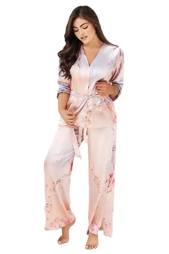 PIJAMA Pantalón y camisa en Satin Estampado tipo lienzo decorada con un delicado cinturón
