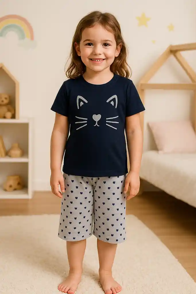 Lindo Conjunto carita de gato. Pijama para niñas multifuncional de 2 piezas Talla 6. Suaves y muy cómodos Largo del Short 42Cm