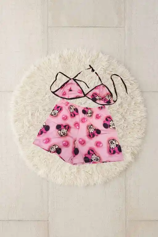 Pijamas de 2 piezas tipo top, color rosada estampada de mini. Talla unica
