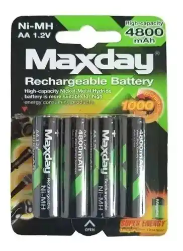 1.2V. Es recargable. Tiene una capacidad de 4800 mAh. Pilas recargables AA con capacidad de 4800 mAh. • 1.2V. No desarmar las baterías, generar cortos circuitos, o ponerlas a altas temperaturas por seguridad, no mezclar con baterías descargadas al uso, no mezclar con baterías no recargables de diferentes tamaños, mantener las baterías en un ambiente fresco y seco si no van a ser utilizadas. CONTENIDO DEL EMPAQUE: 4 Baterías AA Maxday Recargables