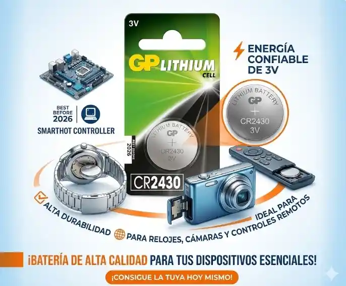 🔋 Pila de Botón de Litio CR2430 GP 🔋 La pila de botón CR2430 GP es la solución perfecta para alimentar tus dispositivos pequeños con alta eficiencia y duración. Con una capacidad de 3V, esta batería es ideal para relojes, cámaras, controles remotos, calculadoras, y otros dispositivos electrónicos de bajo consumo. ⏰📡🎮 ✅ Características principales: ⚡ Alta durabilidad: Proporciona energía confiable durante un largo periodo. 🔋 Tamaño CR2430: Compatible con una amplia gama de dispositivos electrónicos pequeños. 💡 Voltaje de 3V: Garantiza una energía estable y constante para tus equipos. 🎯 Ideal para dispositivos pequeños: Perfecta para relojes, controles remotos, cámaras y más. 🌱 Ecológica: Batería eficiente y de alta calidad, respetuosa con el medio ambiente.