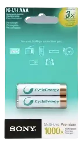 Tipo: Níquel-metal hidruro (Ni-MH), tamaño AAA. Capacidad: Típica de 1600mAh y mínima de 1550mAh. Voltaje: 1.2V. Duración: Diseñadas para durar hasta 3.5 veces más que las alcalinas convencionales. Ciclos: Recargables hasta 1000 veces para uso reutilizable