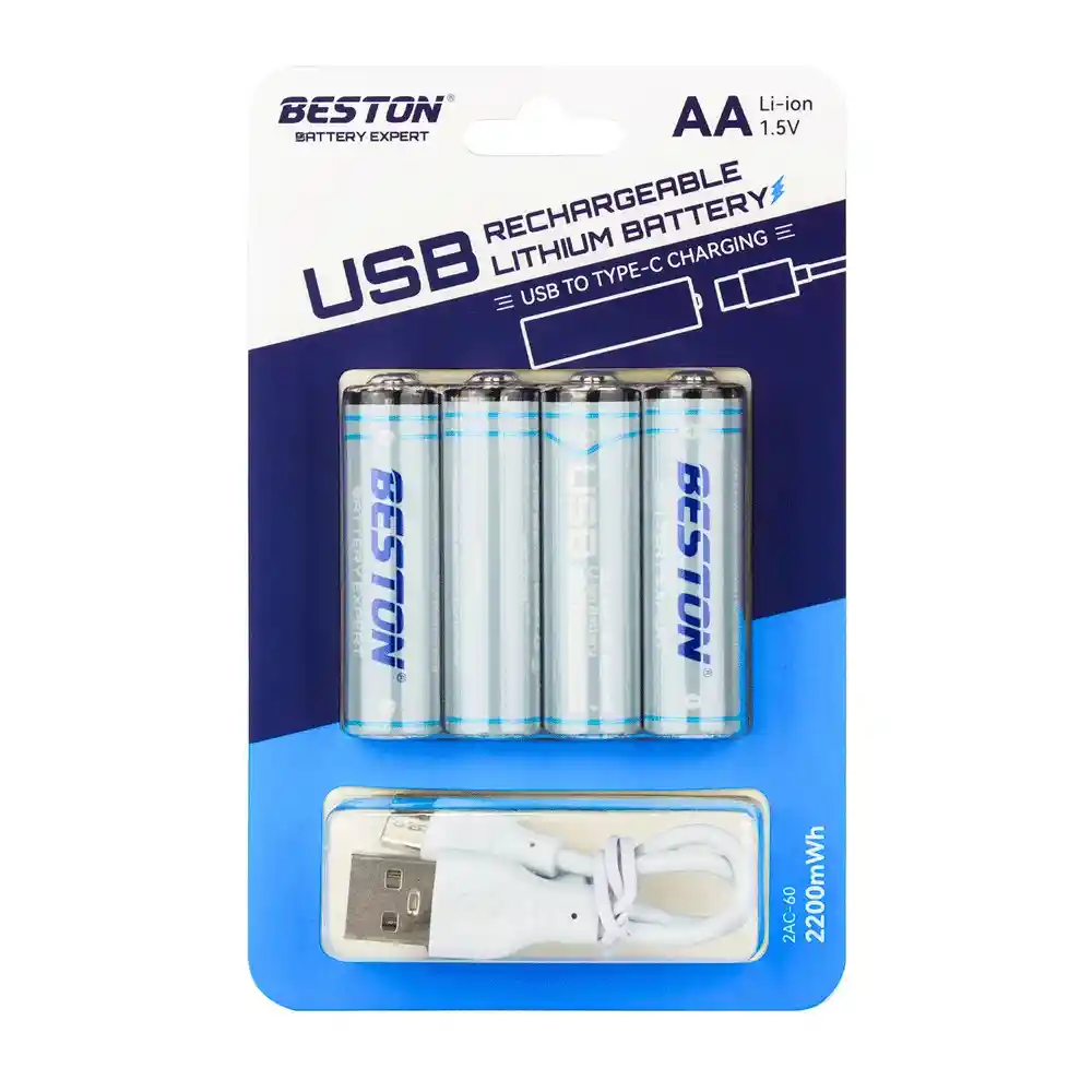 · Baterías recargables usb tipo C: · AA x 4 unidades · Potencia nominal: 2200 mwh/1,5V 1460 mAh · Tensión nominal: 1,5 V · Entrada USB: 5 v/450 ma ± 50 ma · Parámetros de salida: 1,5 v/1,5 a (máx.) · Peso del producto: 16,5 ± 0,5 g · Modo de carga: cable de carga USB tipo c · Incluye cable de carga · Equipo de aplicación: juguetes, mouse, micrófono, y otros dispositivos.