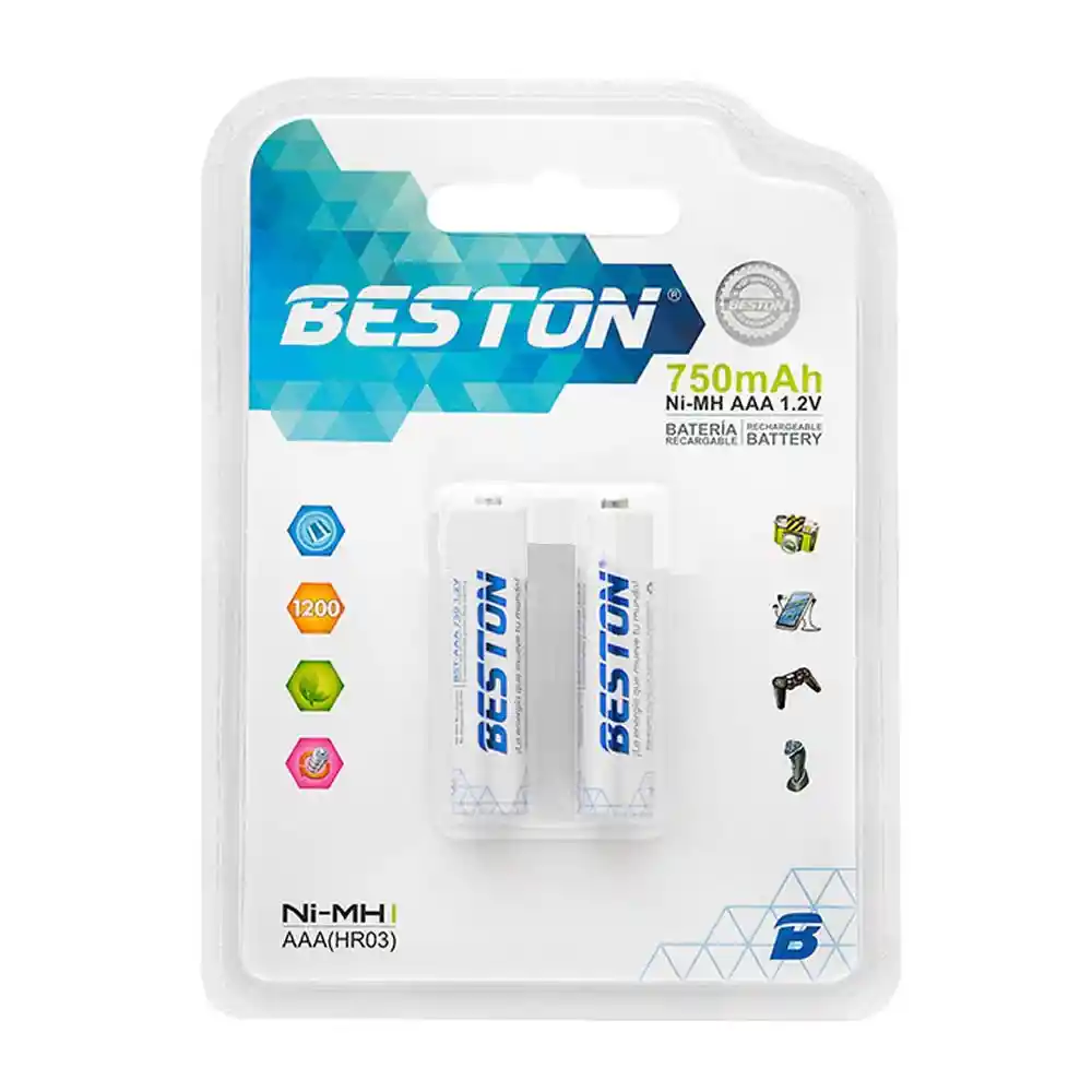 Recomendaciones No haga cortocircuito, no desmonte las baterías en un lugar de alta temperatura o en el fuego, en caso de peligro No cargue las baterías Ni-MH junto con las baterías secas No las mezcle al momento de utilizar baterías Ni-Cd y Ni-MH con diferentes capacidades y tamaños Por favor cargue completamente las baterías y póngalas en un lugar fresco y seco, si no se van a usar durante mucho tiempo Por favor cargue completamente las baterías al usarlas por primera vez Por favor cargue las baterías con cargadores Beston Especificaciones técnicas Marca: Beston Referencia: BST-AAA750x2 Voltaje: 1.2V Tipo: Ni-MH (Nickel-Metal Hydride) Capacidad: 750 mAh Ciclos de uso: 1200 Recargable: si