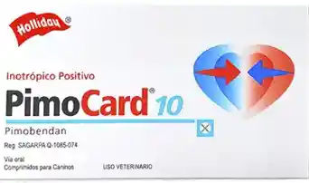 Acción Pimocard 10mg: Aumenta la fuerza de contracción cardíaca debido a dos mecanismos: 1) sensibilización del miocardio a los efectos del calcio. 2) por inhibición de la enzima fosfodiesterasa-III. Reduce la resistencia vascular generando vasodilatación. Acciones Secundarias Prolonga el potencial de acción de la célula cardíaca y reduce la tendencia a arritmias por reentradas. Evita la agregación plaquetaria e impide la formación de trombos. Reduce las catecolaminas y por consecuencia el estrés Indicaciones Pimocard 10mg: Insuficiencia cardíaca congestiva tipo C en perros debido a insuficiencia valvular o cardiomiopatía dilatada. Fórmula Pimocard 10mg: Cada comprimido contiene: Pimobendan 1,25 mg/2,5mg ,5mg y 10 mg según presentación. Excipientes c.s. Posología y Administración Perros: 0,2 y 0,6 mg de pimobendán por kg de peso por día repartida en dos administraciones de 0,25 mg por kg cada una (equivalente a 1 comprimido cada 5 kilos, cada 10 kilos o cada 20 kilos o cada 40 kilos cada 12 horas según presentación). Se recomienda administrar una hora antes de las comidas. Cointraindicaciones No se debe administrar en casos de cardiomiopatías hipertróficas o condiciones clínicas donde no sea posible un aumento del gasto cardíaco debido a condiciones funcionales o anatómicas (p.ej.: estenosis aórtica). Como pimobendán se metaboliza en el hígado, no debe utilizarse en perros que padecen insuficiencia hepática grave. No usar encaso de hipersensibilidad al principio activo o a alguno de los excipientes. Efectos Colaterales En ocasiones poco comunes se han notificado reacciones adversas gastrointestinales, tales como vómitos y diarrea. Restricciones de Uso Solo se recomienda su uso durante la gestación y la lactancia si el beneficio terapéutico supera el riesgo potencial. No es recomendable utilizar en cachorros. Precaución La absorción del producto se modifica cuando se administra con el alimento. Por lo tanto, la eficacia óptima se obtiene con el estómago vacío, debe administrarse una hora antes de las comidas. En animales diabéticos, los niveles de glucosa deben controlarse de forma estricta.