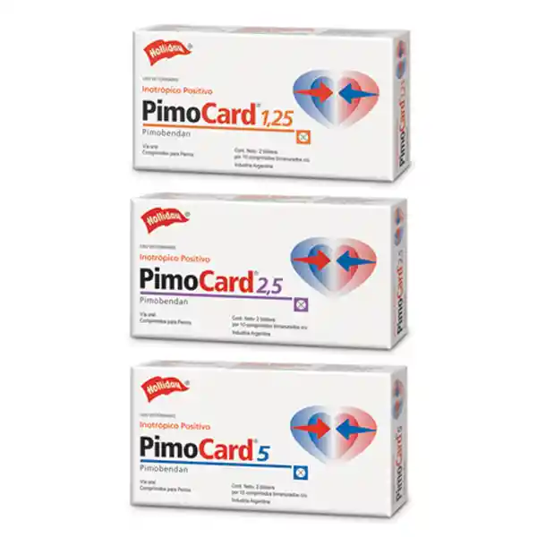 Pimobendan (1.25 mg). Caja Con 20 Tabletas. Pimocard Descripción Inotrópico Positivo y Vasodilatador Periférico en Comprimidos Para en Base a Pimobendan. Presentación Estuches Con 2 Blisters de 10 Comprimidos Cada Uno. Acción Aumenta la Fuerza de Contracción Cardíaca Debido a Dos Mecanismos: 1) Sensibilización Del Miocardio a Los Efectos Del Calcio. 2) Por Inhibición de la Enzima Fosfodiesterasa-Iii. Reduce la Resistencia Vascular Generando Vasodilatación. Acciones Secundarias: Prolonga el Potencial de Acción de la Célula Cardíaca y Reduce la Tendencia a Arritmias Por Reentradas. Evita la Agregación Plaquetaria e Impide la Formación de Trombos. Reduce Las Catecolaminas y Por Consecuencia el Estrés Indicaciones Insuficiencia Cardíaca Congestiva Tipo C en Perros Debido a Insuficiencia Valvular o Cardiomiopatía Dilatada. Fórmula Cada Comprimido Contiene: Pimobendan 1,25 mg/2,5 mg y 5Mg Según Presentación. Excipientes C. S. Posología y Administración Perros: 0,2 y 0,6 mg de Pimobendán Por Kg de Peso Por Día Repartida en Dos Administraciones de 0,25 mg Por Kg Cada Una (Equivalente a 1 Comprimido Cada 5 Kilos, Cada 10 Kilos o Cada 20 Kilos Cada 12 Horas Según Presentación). Ser Recomienda Administrar Una Hora Antes de Las Comidas. Contraindicaciones no Ser Debe Administrar en Casos de Cardiomiopatías Hipertróficas o Condiciones Clínicas Donde no Sea Posible un Aumento Del Gasto Cardíaco Debido a Condiciones Funcionales o Anatómicas (P. Ej. Estenosis Aórtica). Como Pimobendán Ser Metaboliza en el Hígado, no Debe Utilizarse en Perros Que Padecen Insuficiencia Hepática Grave. no Usar en Caso de Hipersensibilidad al Principio Activo o a Alguno de Los Excipientes.