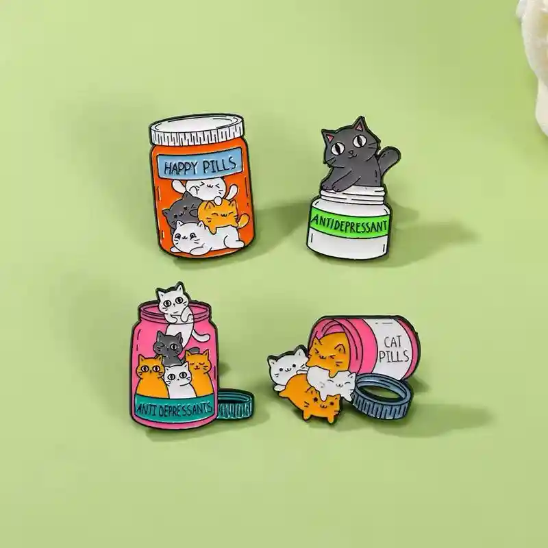 Material: Metal. Medidas: 3*2 cm. Incluye: 1x Pin gato happy pills. Importante: Debido a la diferencia de pantallas y efecto de la luz, el color real del artículo puede ser ligeramente diferente al color mostrado en las imágenes.