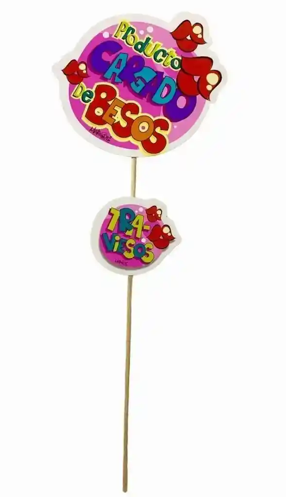 Pin Cumpleaños / Amor y Amistad San Valentín. Mensaje: producto cargado de besos traviesos. Medidas del pin 11cm x 11cm, altura 30 cm aprox