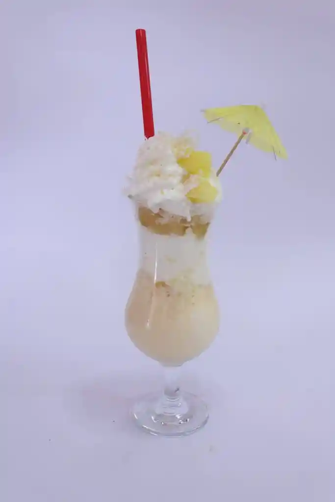 Un sabor de helado de vainilla bañado en licor de piña colada, trozos de piña, coco rayado y chantilly.