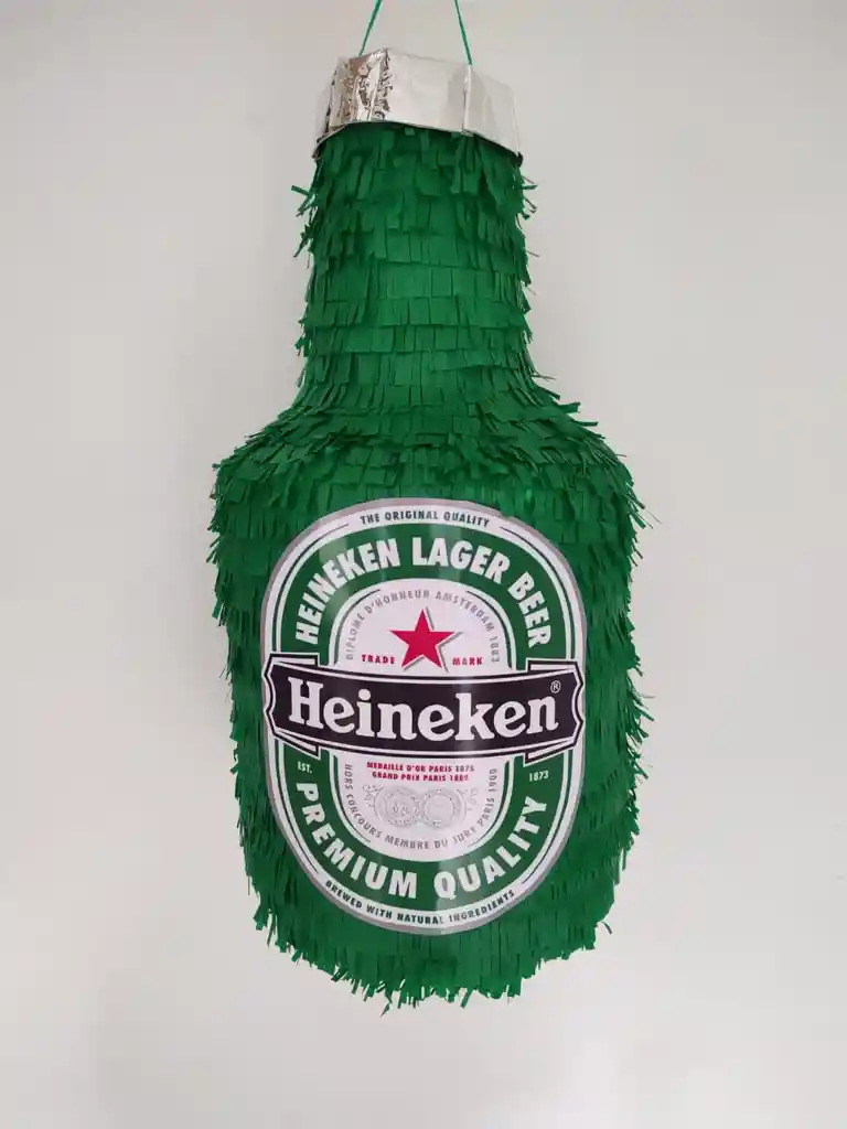 Piñata amigable con el medio ambiente hecha en papel y cartón reciclado en forma de Botella Heineken en tamaño de 60 cm de alto aprox. Piñata Va sin relleno. (Si deseas incluir algún dulce o relleno tiene un precio adicional)