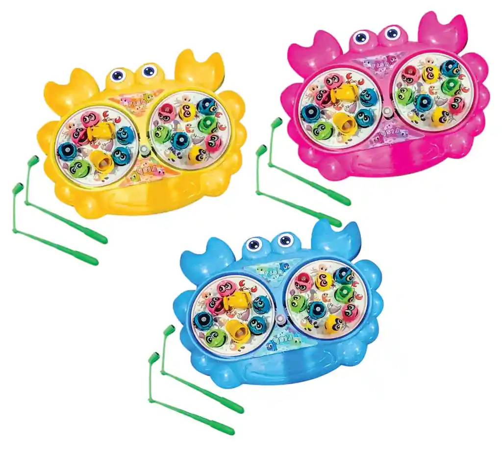 Este juguete es un juego de pesca giratorio diseñado para niños. Funcionamiento: Los peces giran en la base mientras abren y cierran la boca, y los jugadores usan cañas de pescar con imanes para atraparlos. Habilidades: Ayuda a desarrollar la coordinación ojo-mano y la motricidad fina. Componentes: Incluye la base giratoria en forma de cangrejo y cañas de pescar. Edad recomendada: Generalmente apto para niños mayores de 3 años