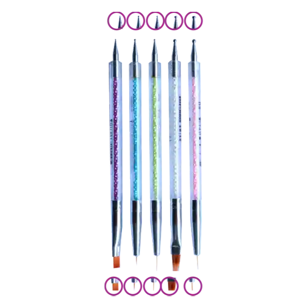 Ideal para decoracion y Arte de uñas. Crea lineas de dibujo, perfecciona detalles finos, flores, patrones, etc. Para uso profesional y personal. Paquete por cinco (5) punzones dobles, por un lado un punzon y en el otro un pincel.