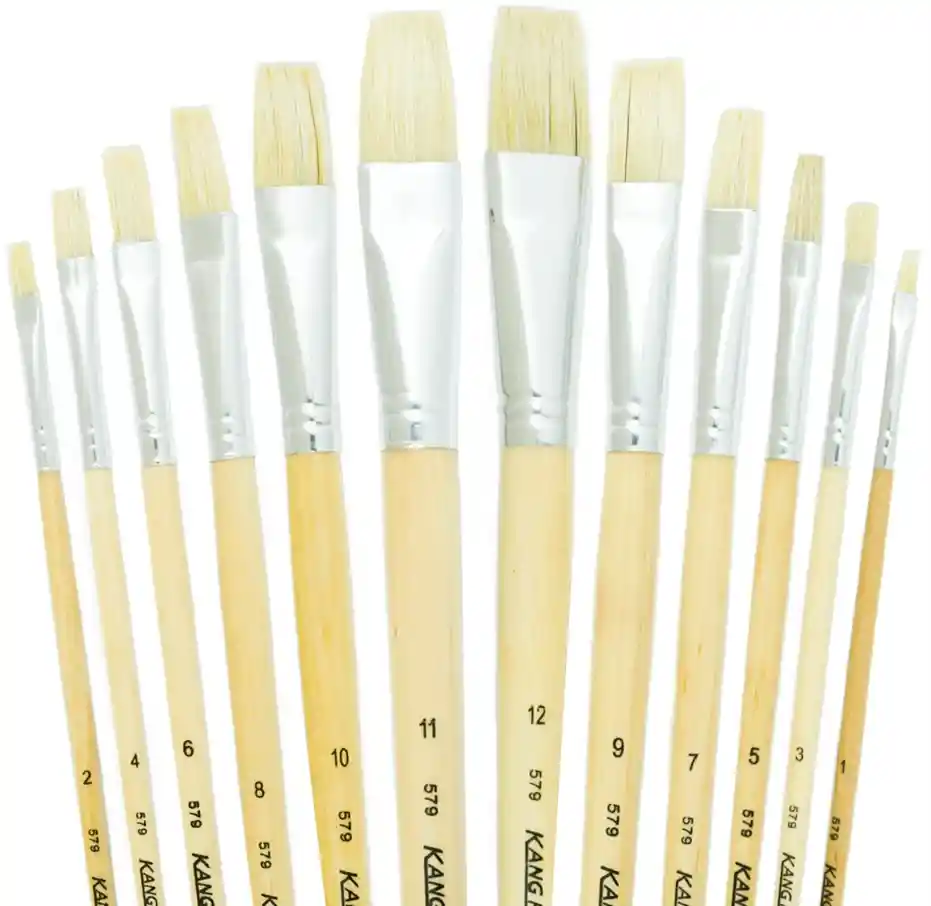 Usos Comunes El pincel plano es un favorito en muchas técnicas artísticas debido a su funcionalidad: Cubrir Áreas Grandes: Ideal para aplicar bases de color uniformes, fondos y barnices, ya que extiende la pintura de manera eficiente y deja pocas marcas de pincel. Líneas y Bordes Rectos: Su borde afilado permite pintar líneas rectas, bordes de edificios o contornos definidos con gran precisión. Técnicas de Acuarela: En acuarela, se utiliza para lavados (aplicaciones uniformes de color diluido) y para técnicas que requieren bordes nítidos. Óleo y Acrílico: Es esencial para mezclar colores en la paleta y para aplicar pintura en capas con textura (impasto) o en capas suaves. Manualidades y Bricolaje: Muy útil para pintar muebles pequeños, marcos, maquetas y proyectos escolares donde se necesita cubrir superficies con rapidez y uniformidad.