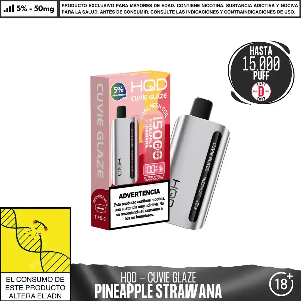 Contenido del paquete: 1 dispositivo desechable Características del dispositivo: Dispositivo de vapeo desechable Material: Aluminio 22 ml de capacidad 1 dispositivo por paquete Batería: 650 mAh (Recargable) USB Tipo C 15000 caladas aproximadamente Ingredientes: Glicerina Vegetal, Propilenglicol, Aromatizantes Naturales y Artificiales, Ácido Benzoico, Nicotina. Advertencia: Contiene nicotina, que puede ser venenoso. Evitar el contacto con la piel y los ojos. No ingerir. Mantener siempre en empaque original y en un ambiente fresco y seco. Mantener alejado de niños y mascotas. No debe utilizarse por Mujeres en estado de embarazo o personas con problemas de respiración como el asma. Prohibida su venta a menores de edad. En caso de accidente contacte a la línea 123.