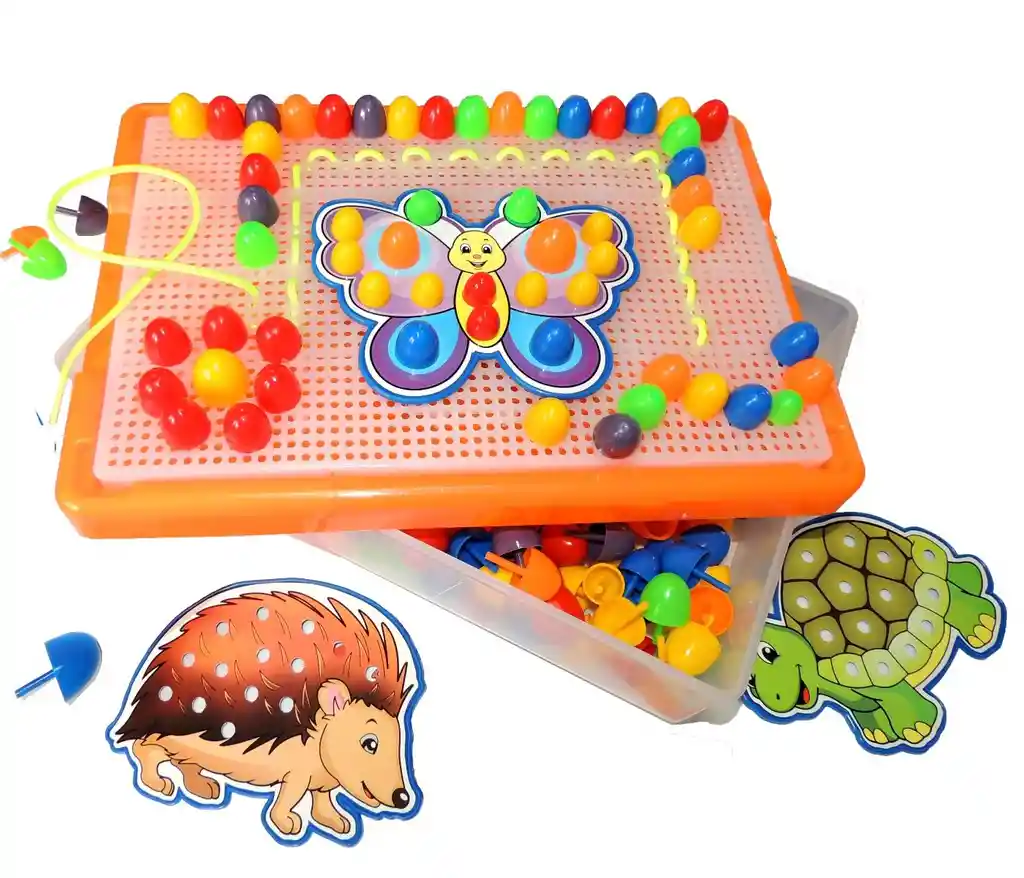 - Contenido: Caja plástica de 31.5 x 22 x 8.5 cm Tablero de 28 x 19 cm. 360 Pines plásticos en 3 tamaños 8 Figuras de enhebrado 8 Cordones. - Empaque: Caja de cartón
