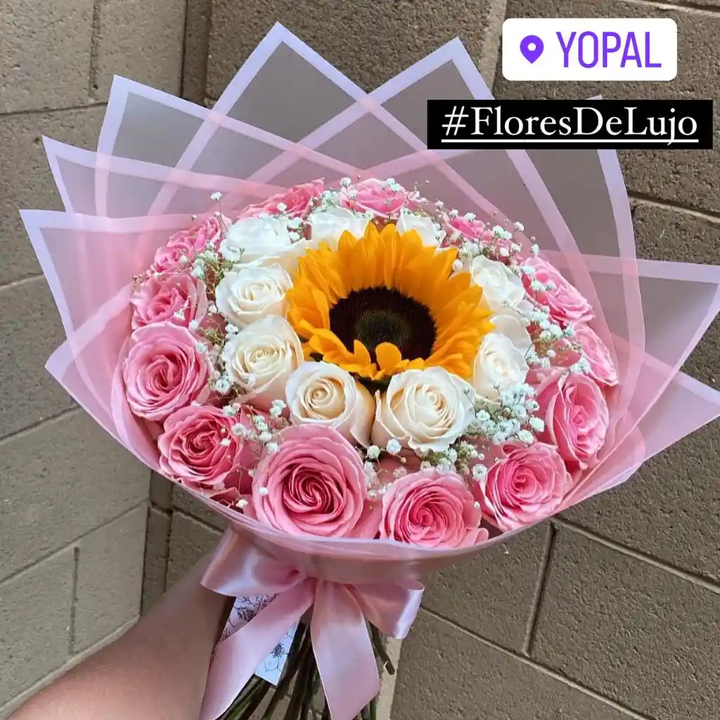 Hermoso ramillete con rosas en tonos rosas, blanca y girasol. Envuelto en elegante papel, moño en tela, tarjeta impresa y mariposa. Este diseño es muy tierno por su combinación de colores.